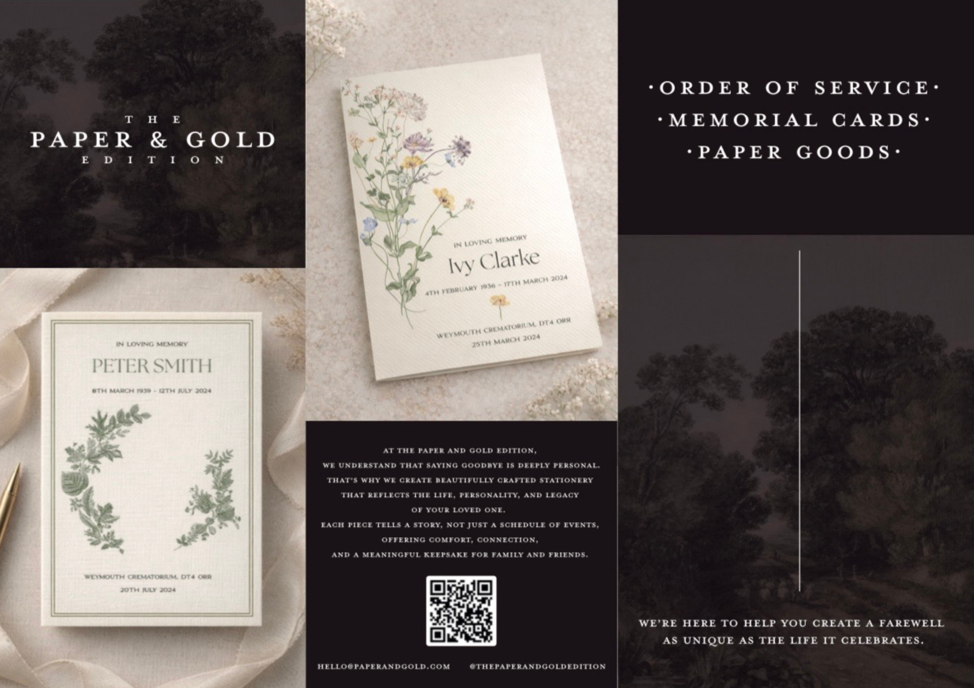 At the Paper & Gold Edition we understand that saying goodbye is deeply personal. That’s why we create beautifully crafted stationary, that reflects the life, personality & legacy of your loved one.